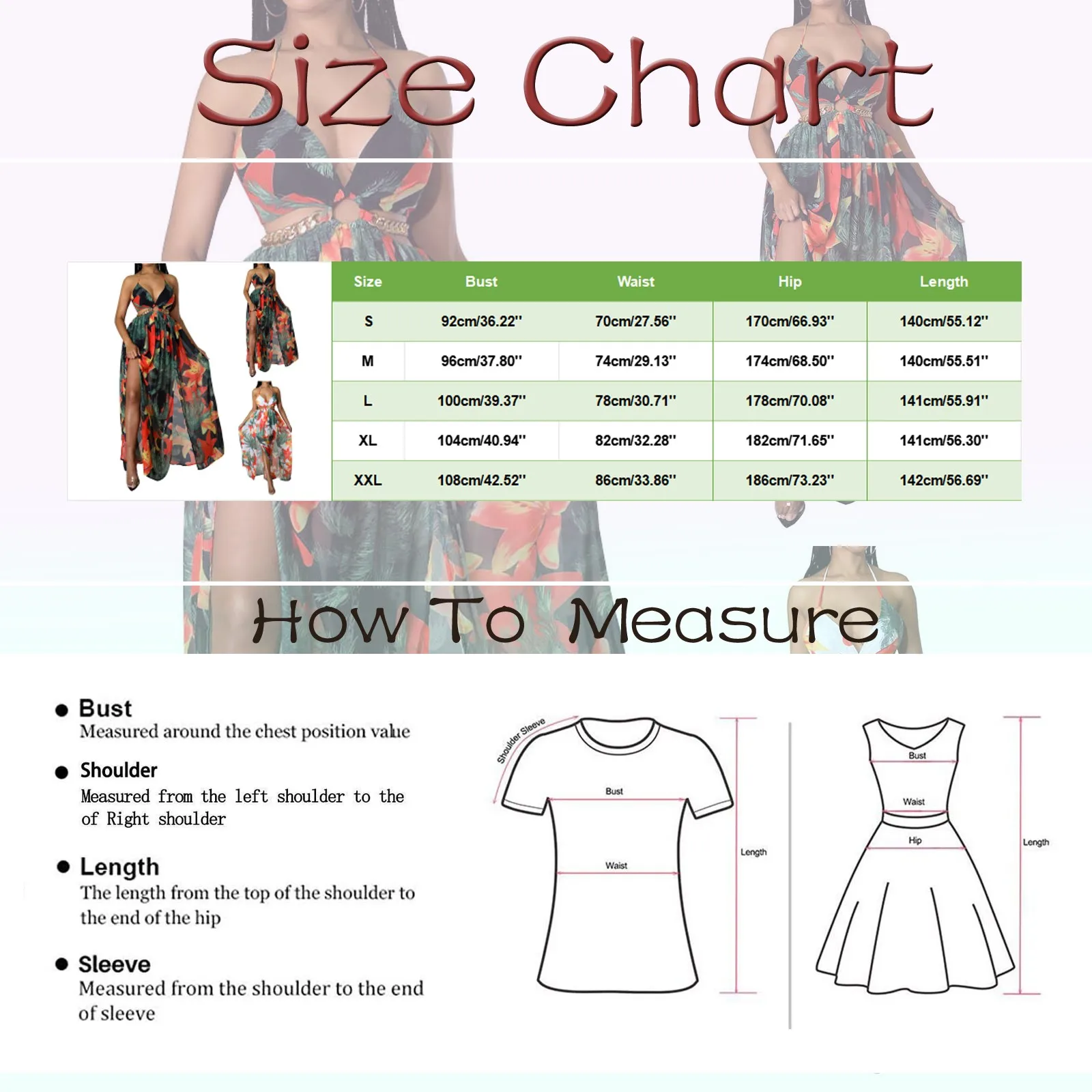 | Size:S | Bust:92cm/36.22” | Waist:70cm/27.56” | Hip:170cm/66.93” | Length:140cm/55.12” |