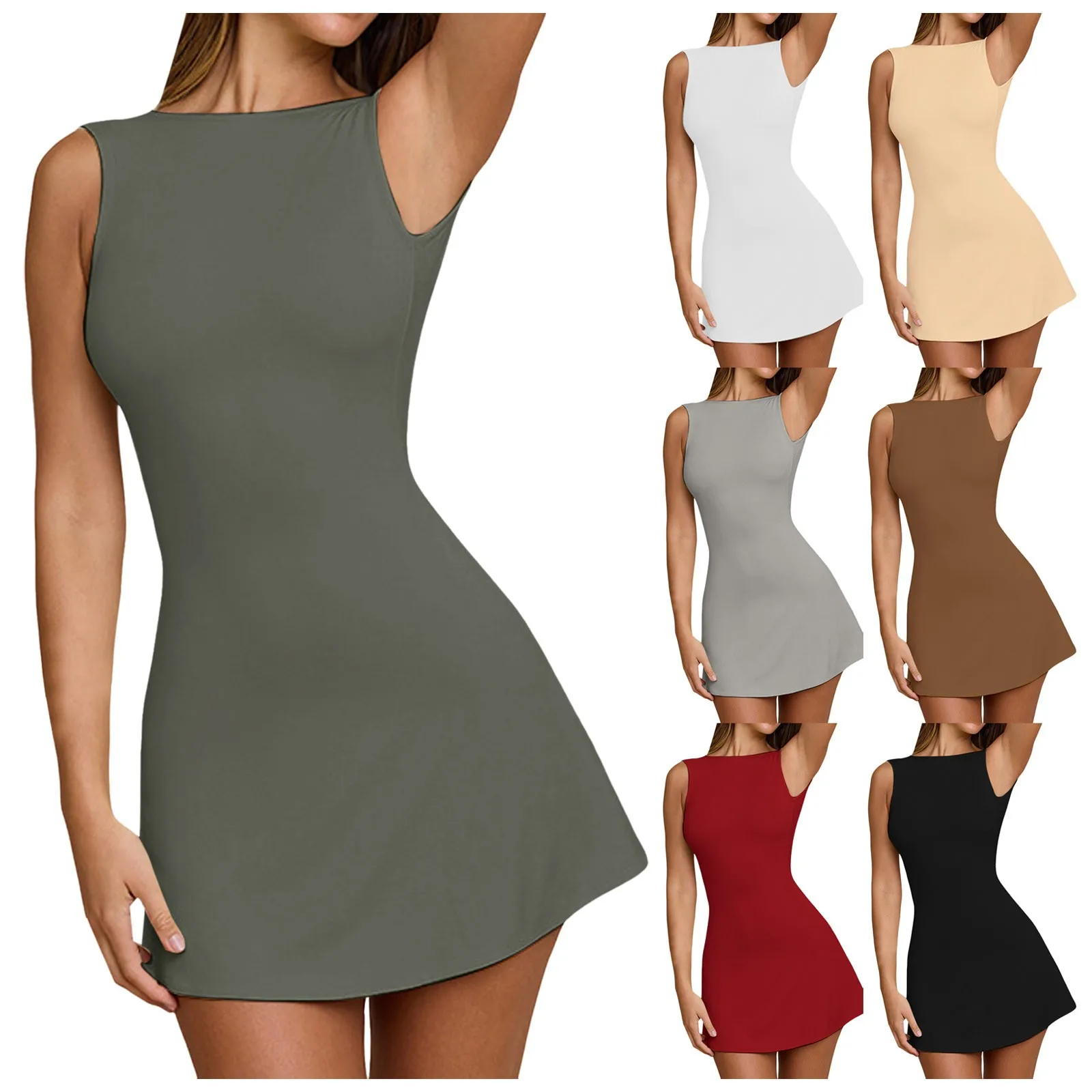 Women’s Sexy Open Back Tunic Dress Crew Neck Sleeveless Stretchy Slim Fit Party Club Mini Tank Dresses